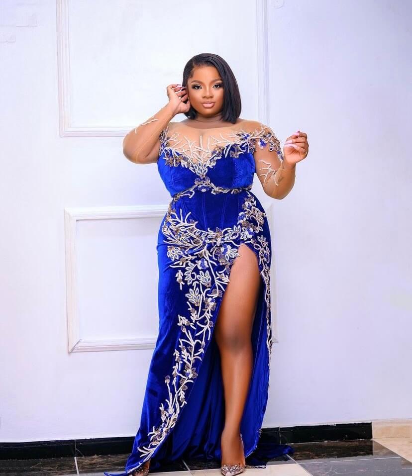 The curvy sweetheart kept things regal as she showed up in a blue corset suede dress that made her look like royalty. The dress had gold rhinestone embellishments around it that further accentuated her royal look.