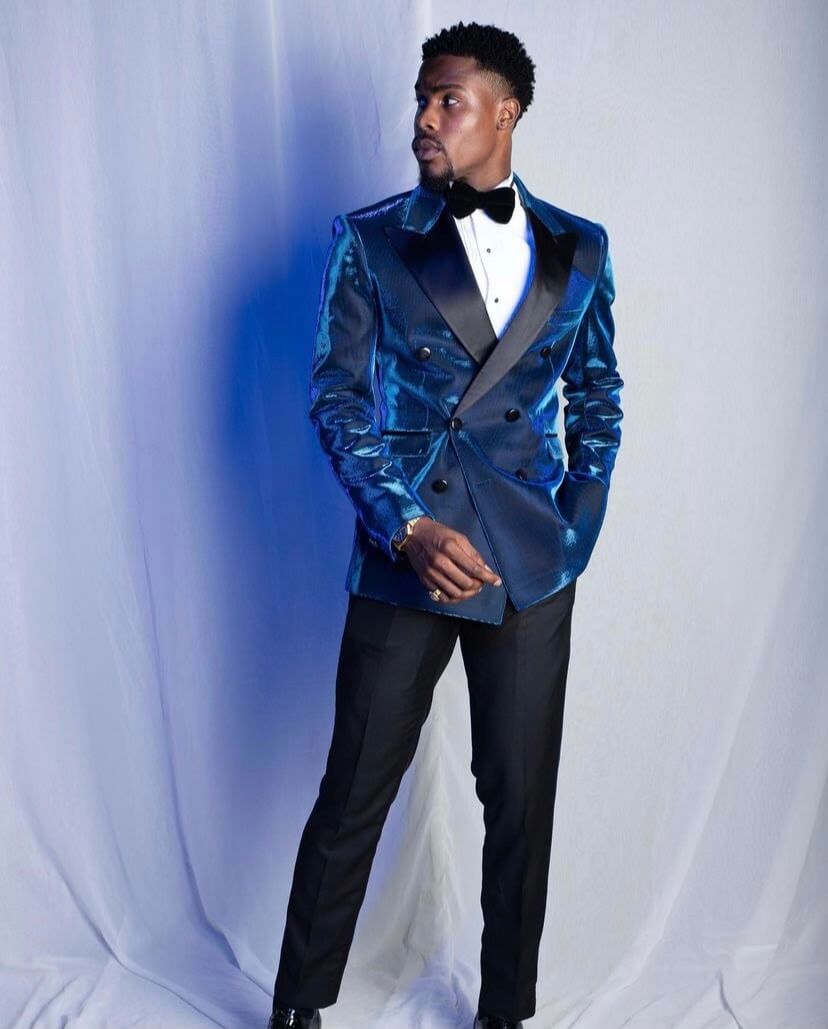 The drip lord dazzled in a double-breasted electric midnight blue tuxedo and a pair of black pants. He paired this look with a lovely pair of the black french bow tie and a pair of black brogue shoes. Neo accessorized with a gold wristwatch, bracelet, and ring. We don’t call him drip lord for nothing! He was looking like a ‘top boy’, and we loved it!