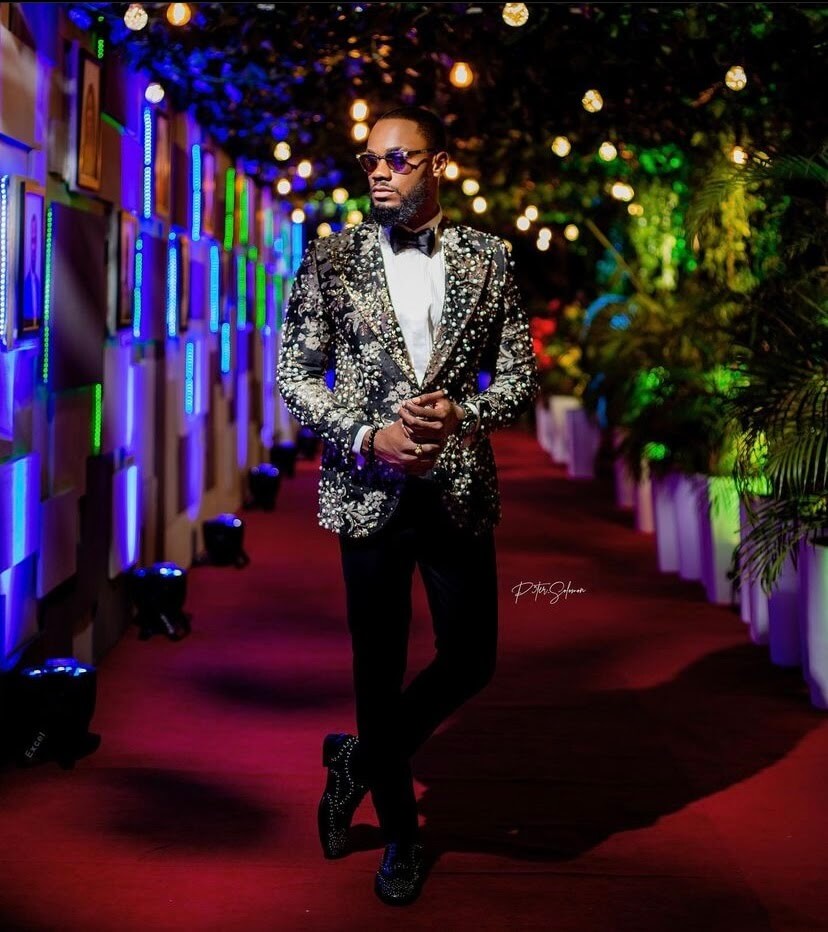 The superstar fashionista and Mr Nigeria spelled royalty in a gold embellished tuxedo, covered up in white pearl studs. He paired this with a black bow tie and black pants to match. He finished up this look with a silver stoned pair of brogue shoes and sunglasses. As the commander-in-chief of the Royal Army, we didn’t expect anything less.